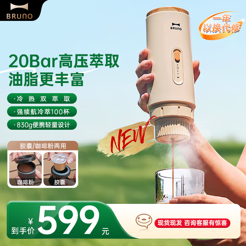 BRUNO便携咖啡机半自动意式胶囊咖啡机家用小型迷你一人户外便携式胶囊机咖啡自由办公室礼物山姆 无线便携 | 胶囊咖啡粉两用 | 冷热双萃取