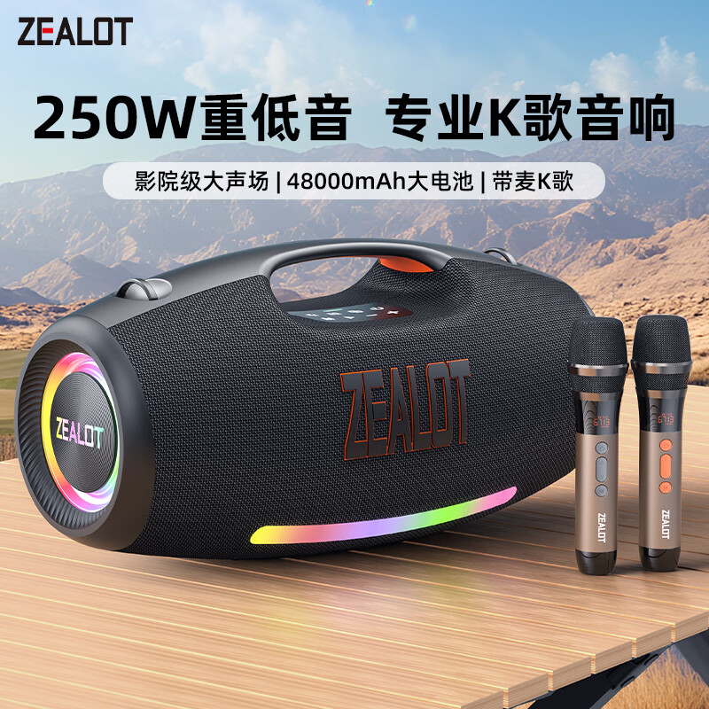 狂热者S89二代音乐玩家便携式无线蓝牙音箱广场舞户外低音炮大功率250W露营车载大音量炫彩灯高音质音响 K歌套餐【双话筒】经典黑