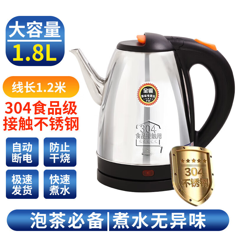 电热水壶304不锈钢长嘴壶家用酒店快速煮水全自动断电防干烧 1.8L 半球长嘴[线长120厘米]