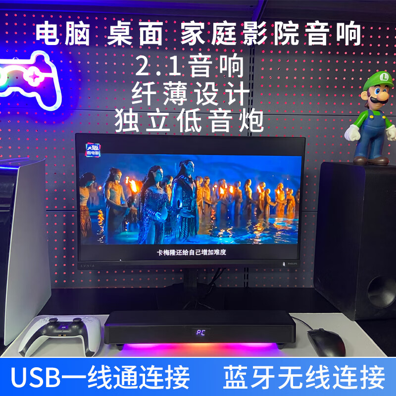 IRONSIMITH百搭家庭影院电竞桌面游戏音箱2.1声道低音炮家用电脑台式电视游戏机投影仪笔记本蓝牙回音壁音响 黑色 V01