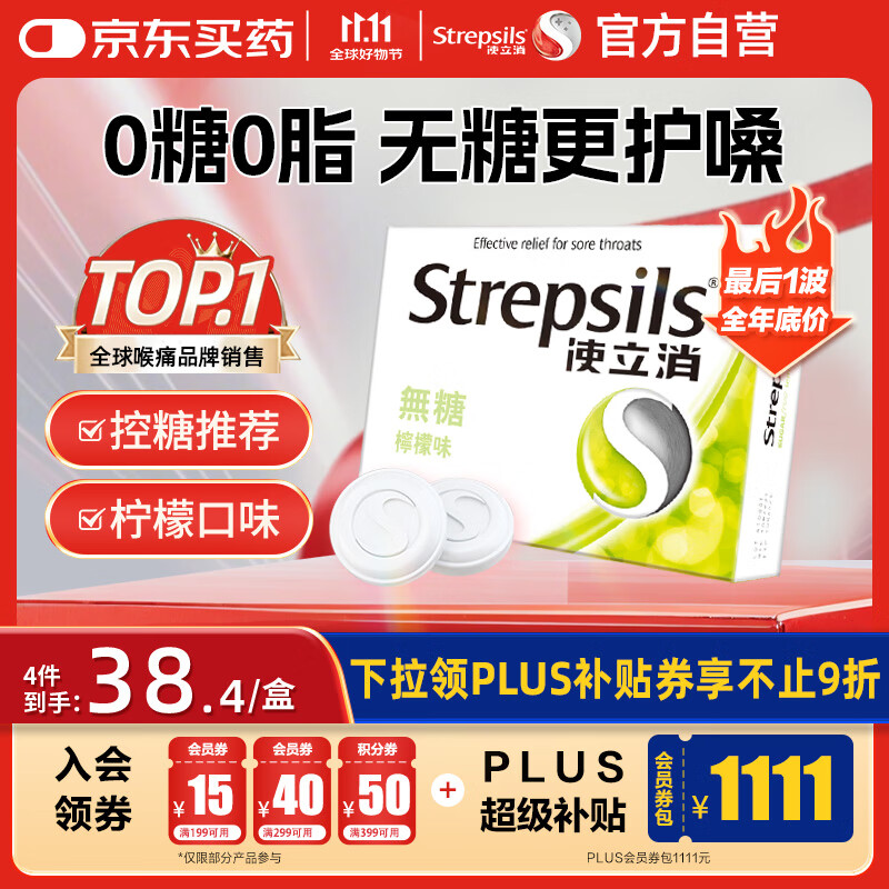 【拍3件121.8亓;plus113.91亓;拍4件153.6亓;plus143.32亓;买4件赠港版蜂蜜柠檬24粒/盒】使立消Strepsils 无糖润喉糖喉咙痛含片 柠檬味16粒/盒