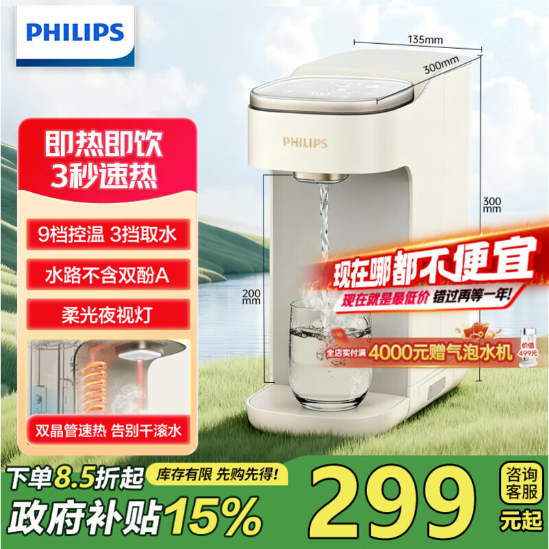 飞利浦(PHILIPS)即热式饮水机 小型家用台式饮水机 免安装桌面智能一键速热饮水机办公室迷你水吧机母婴热水机 即热型 ADD8210【贴心小夜灯】