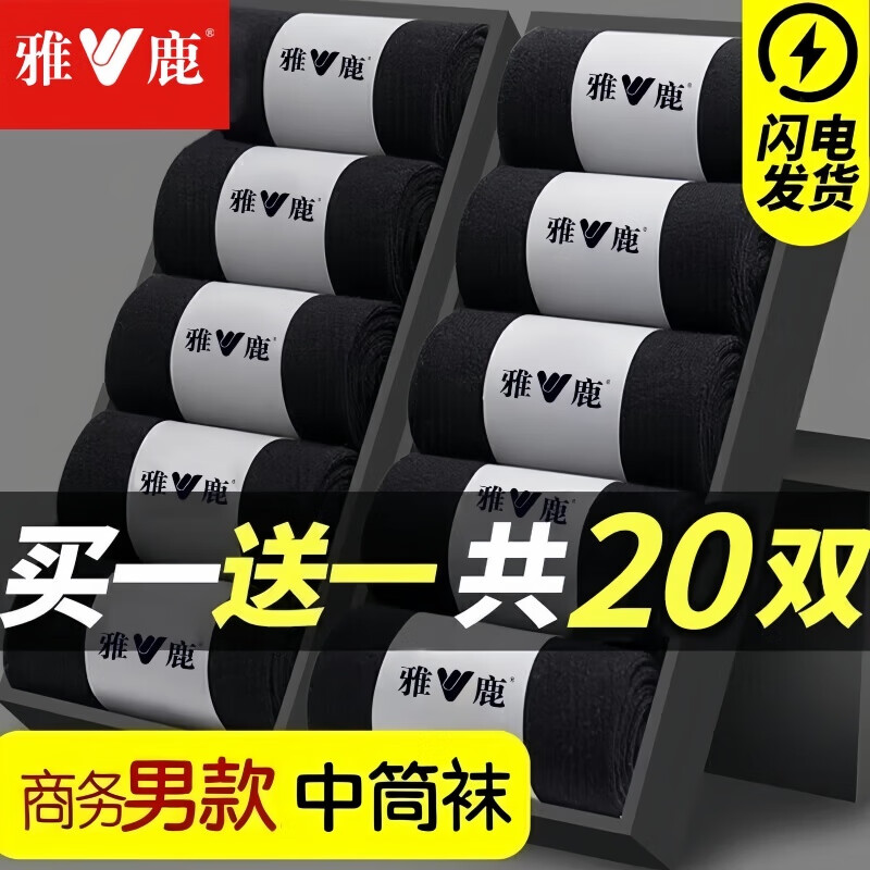 【实付19.9元】雅鹿 男士商务黑色中筒袜 20双均码