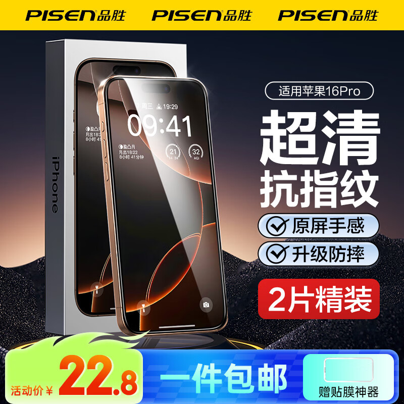 品胜(PISEN)苹果钢化膜iPhone系列手机膜无边全屏高清保护贴膜防摔耐磨抗指纹前膜 16Pro【超清防摔抗指纹】2片